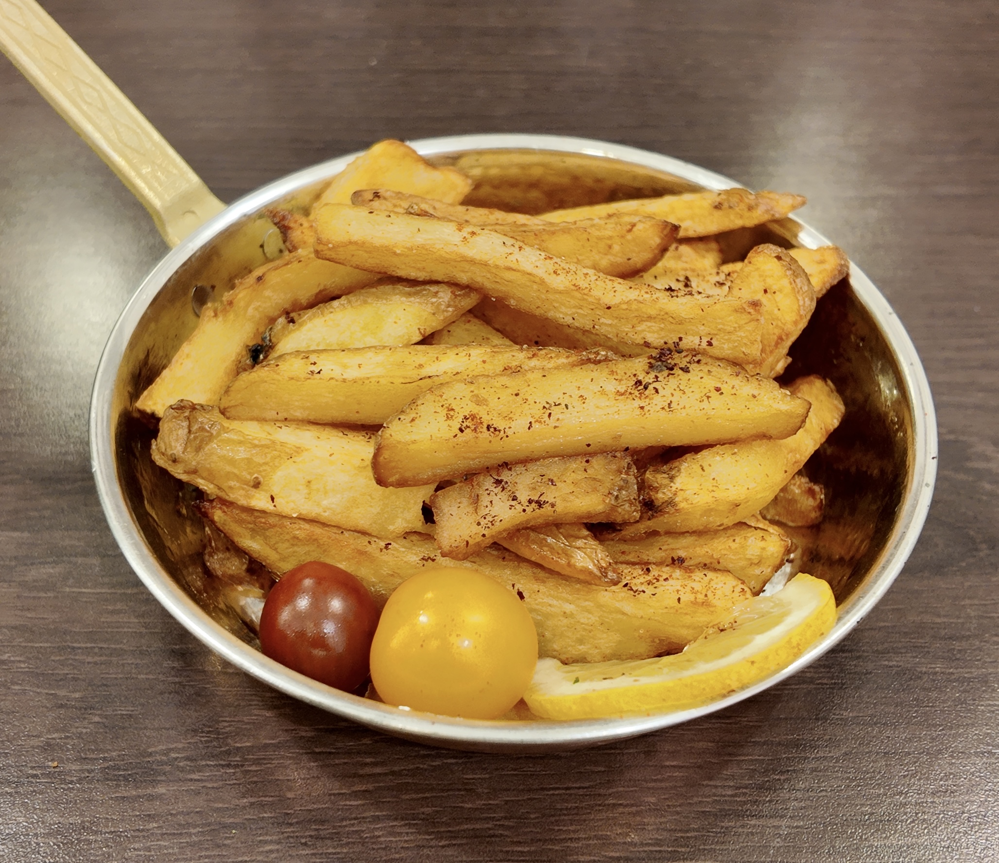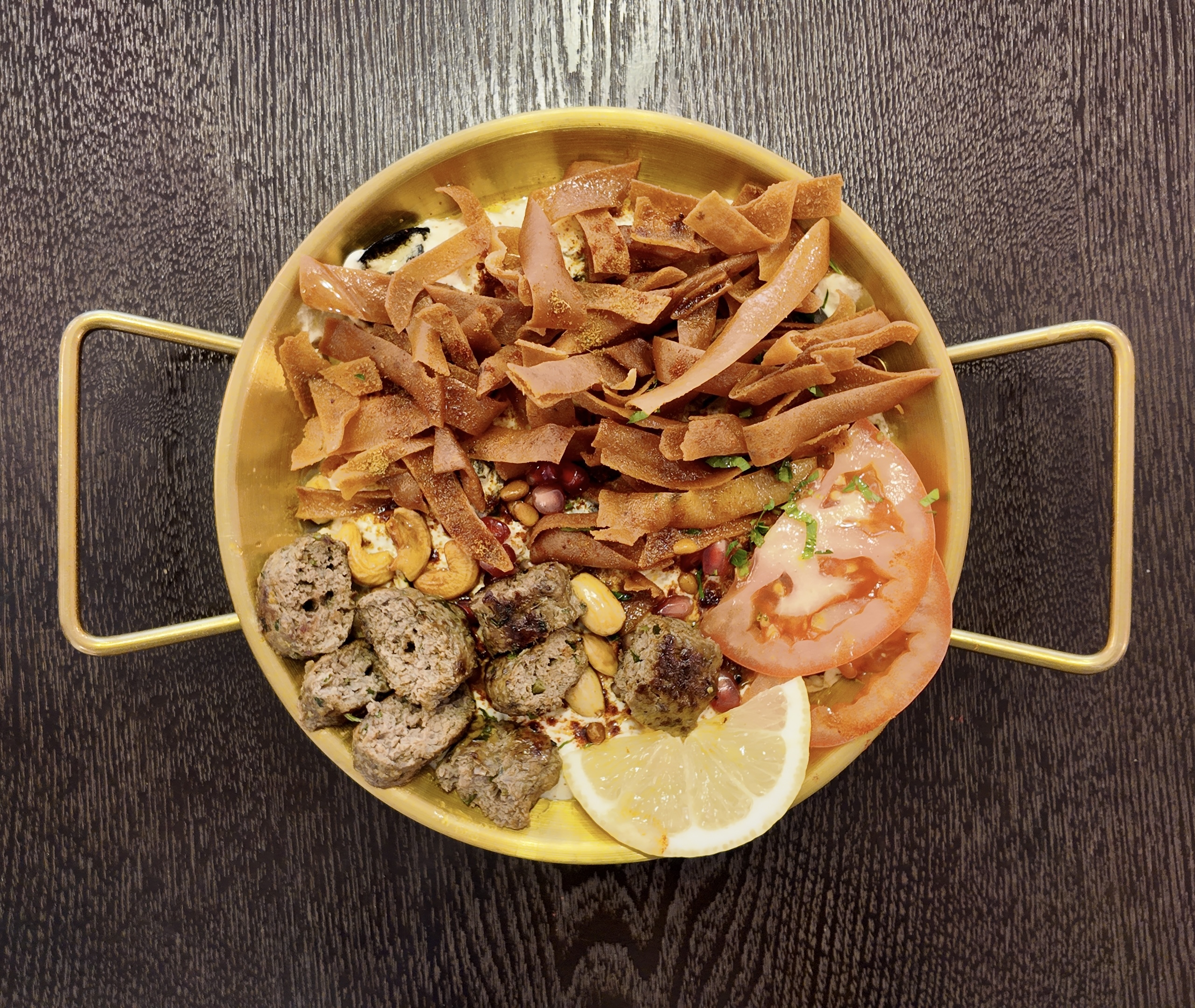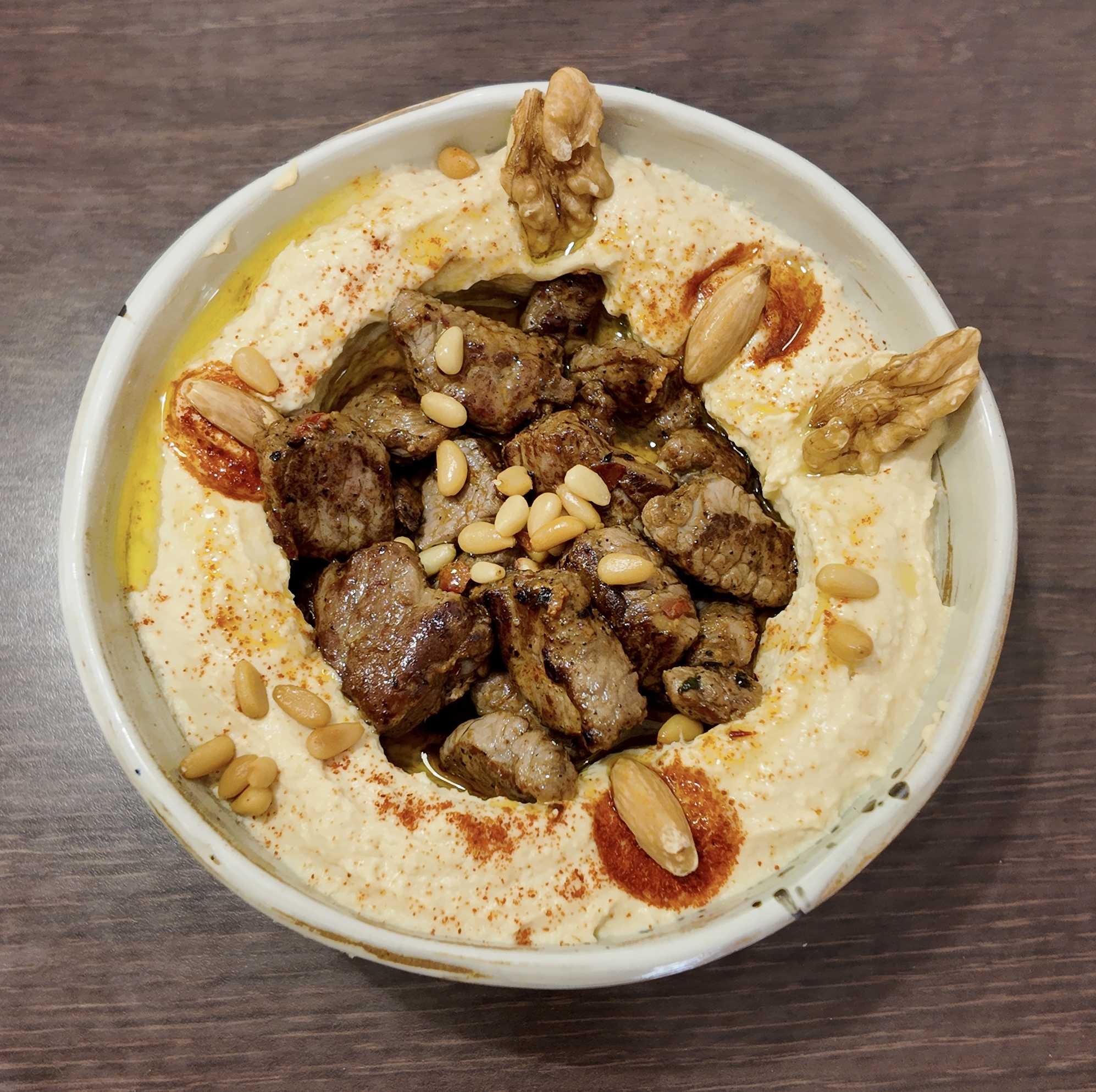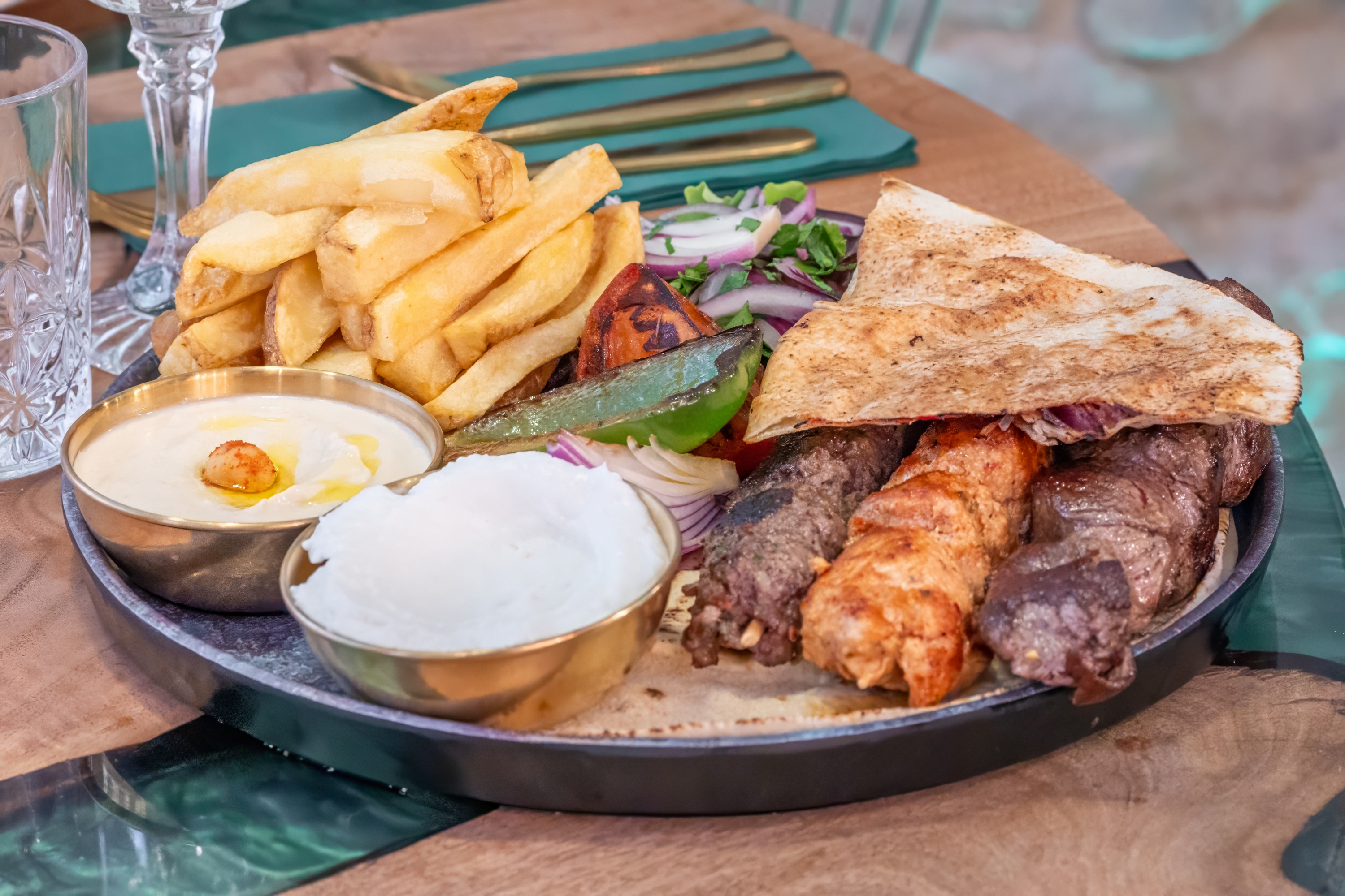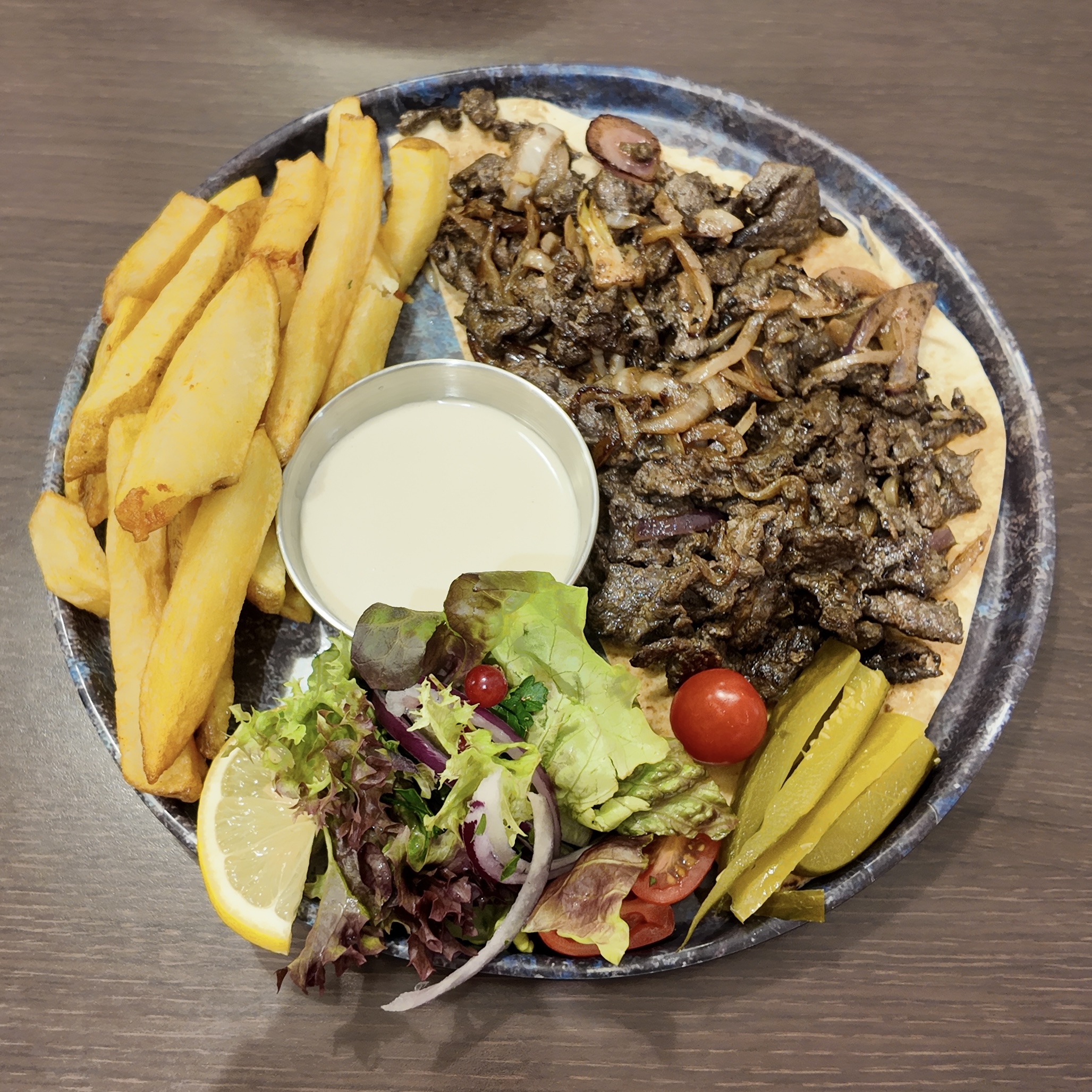 Filets de boeuf émincés au couteau du Chef, marinés aux épices libanais et cuits longuement et soigneusement, accompagnées de frites (ou boulgour) et de sauce Tahiné