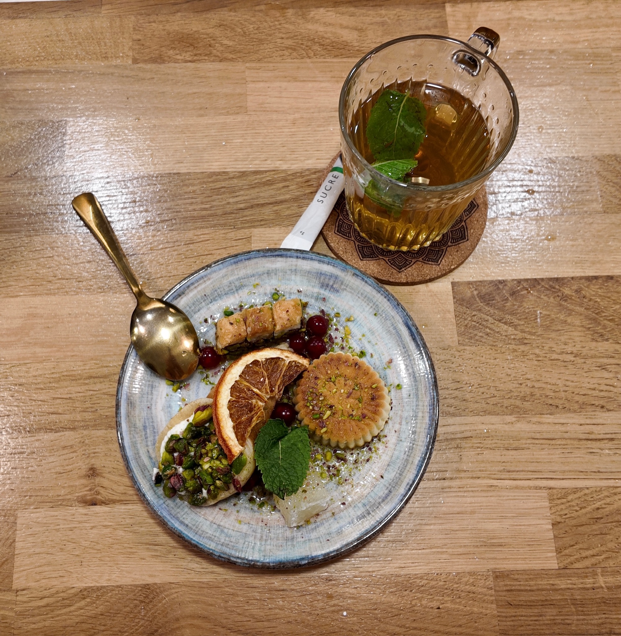 Un café, servi avec un assortiment de douceurs