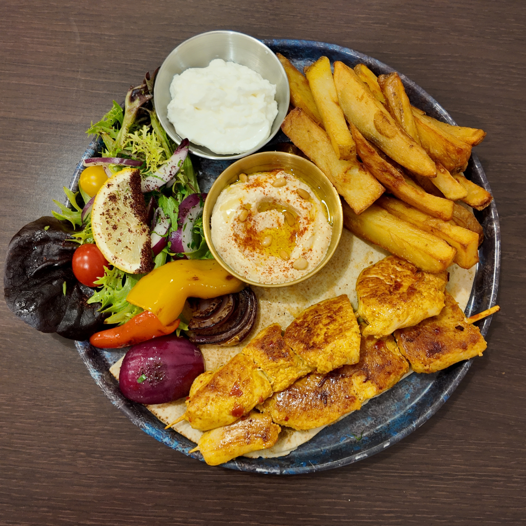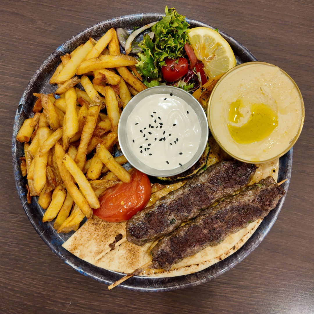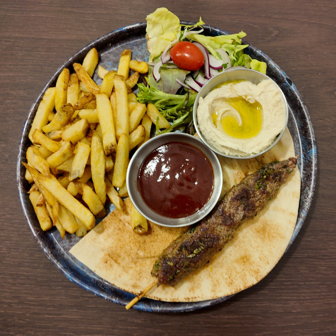 Une brochette de kafta ou de poulet, accompagnée du Houmous, servi avec des frites ou boulgour