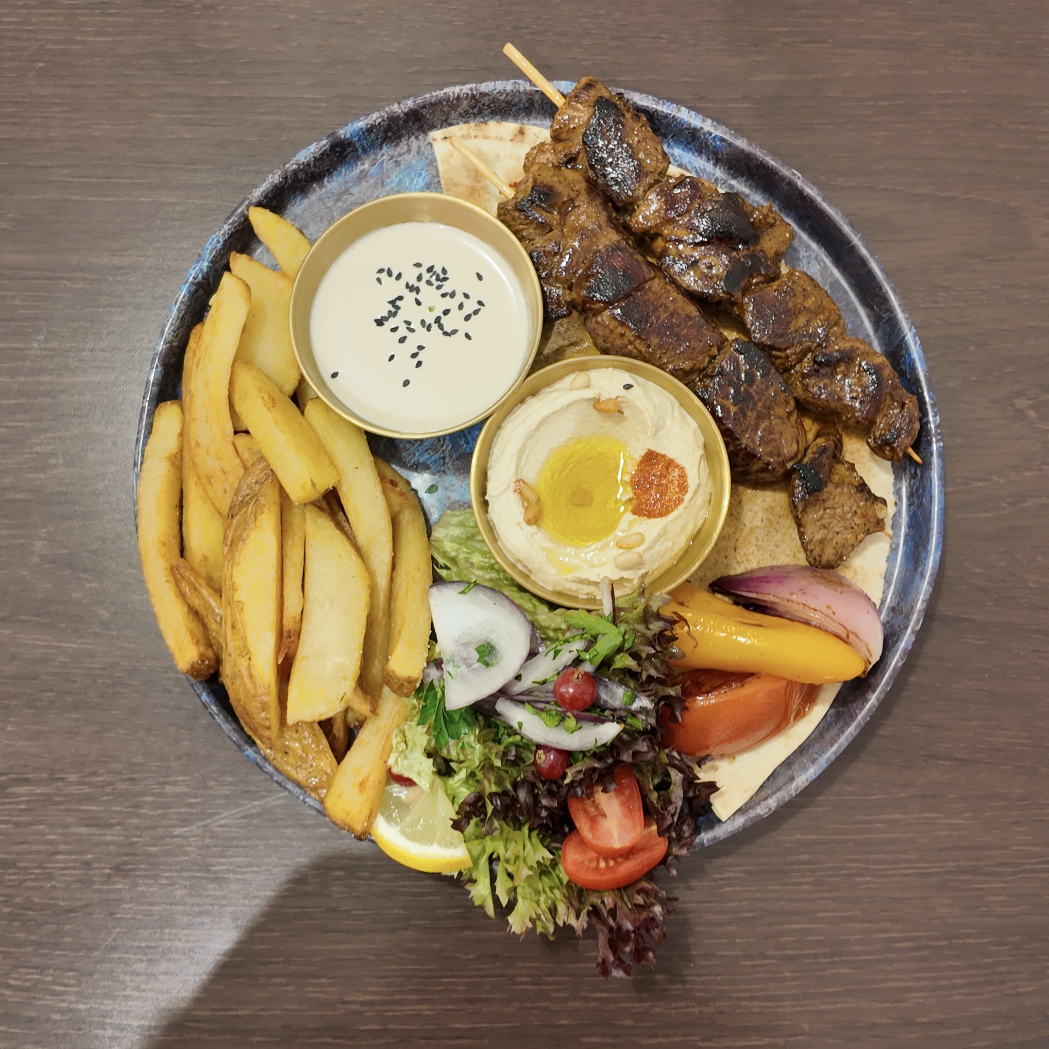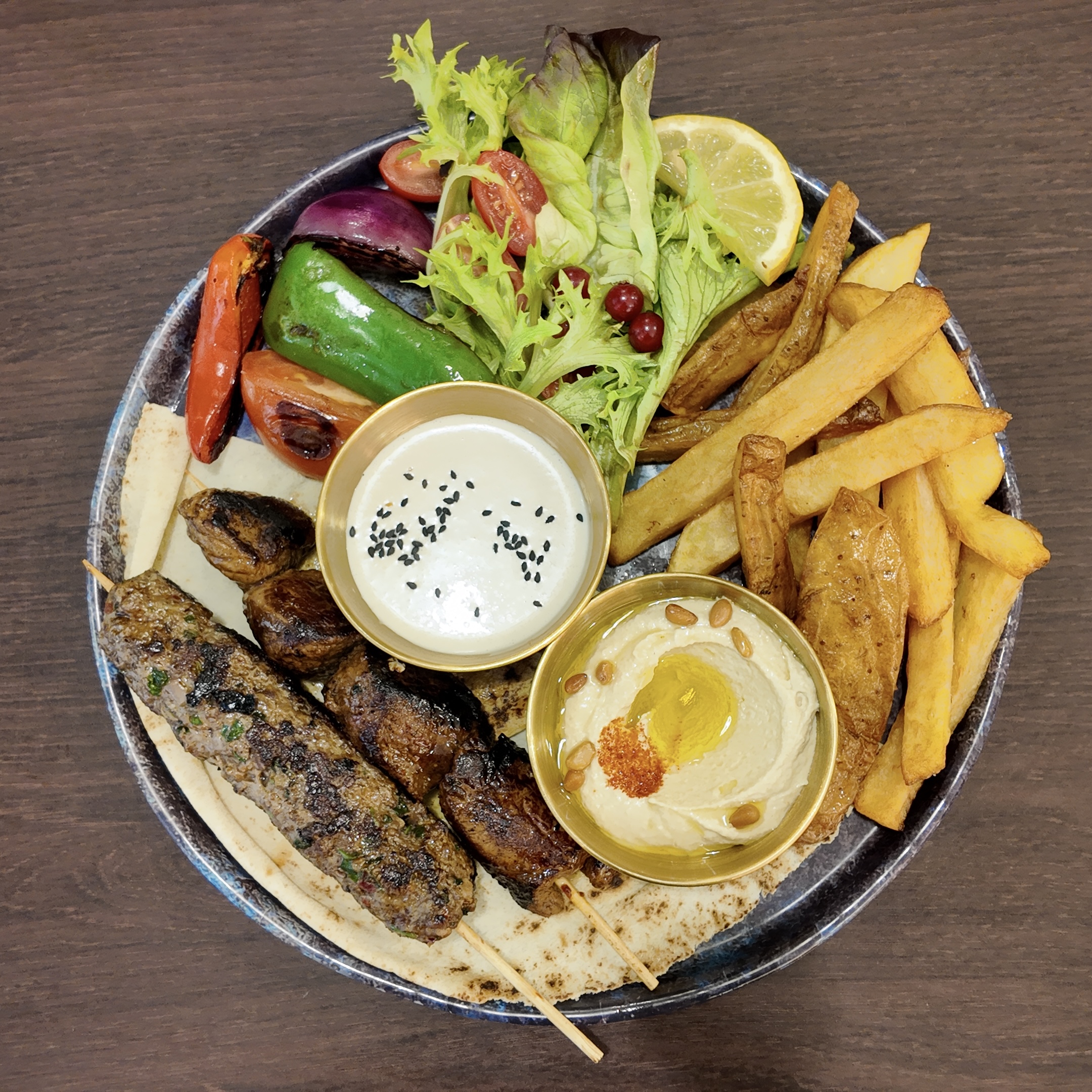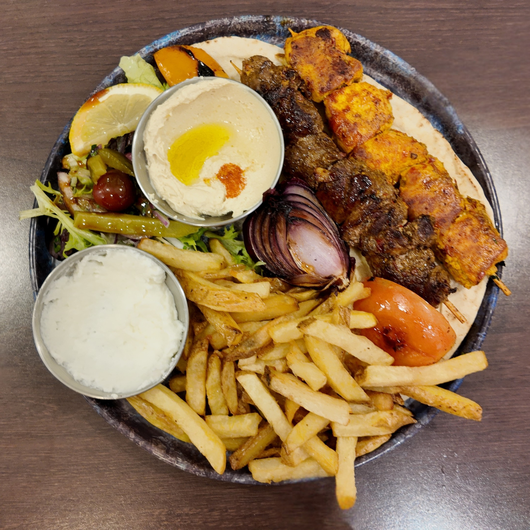 Une brochette de kafta ou de poulet, accompagnée du Houmous, servi avec des frites ou boulgour