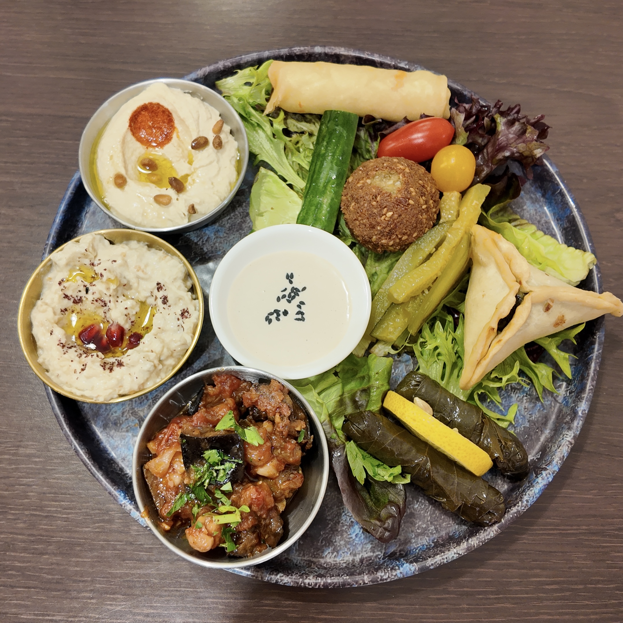 Assortiment de mezzés végétariens: Houmous, Moutabal, Moussaka, Rikakat, Feuille de vigne, falafel et Fatayer épinard.