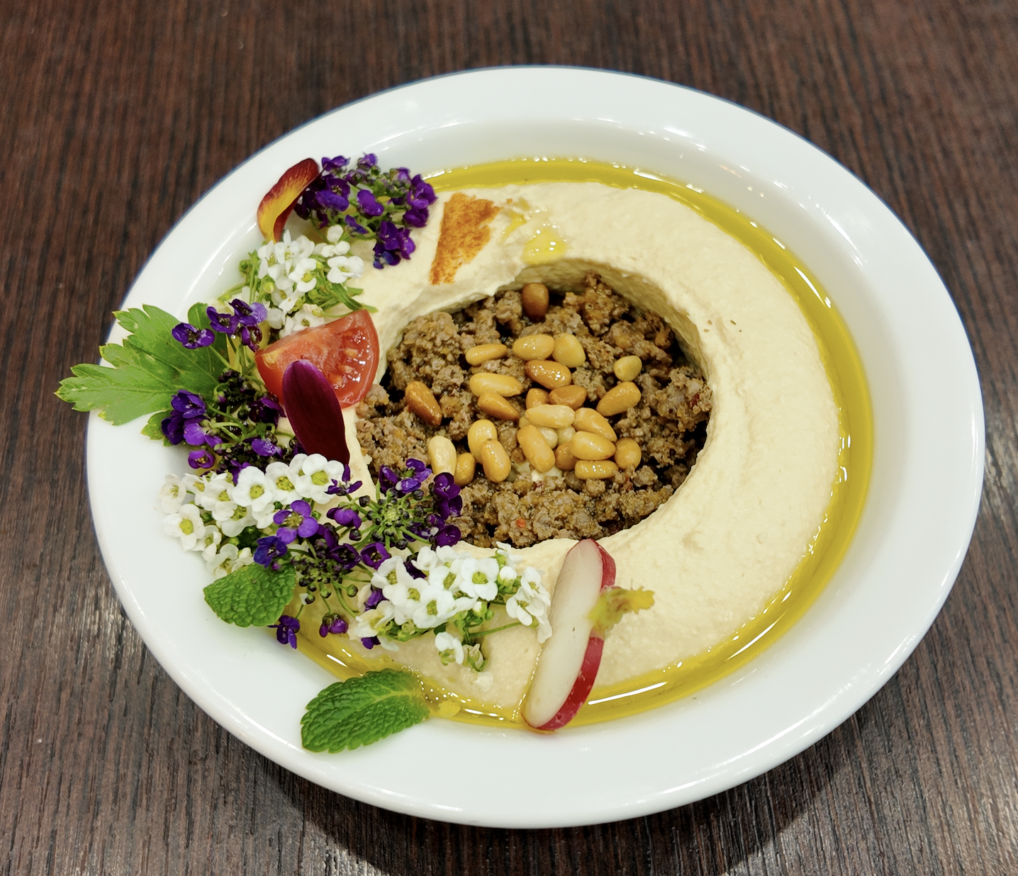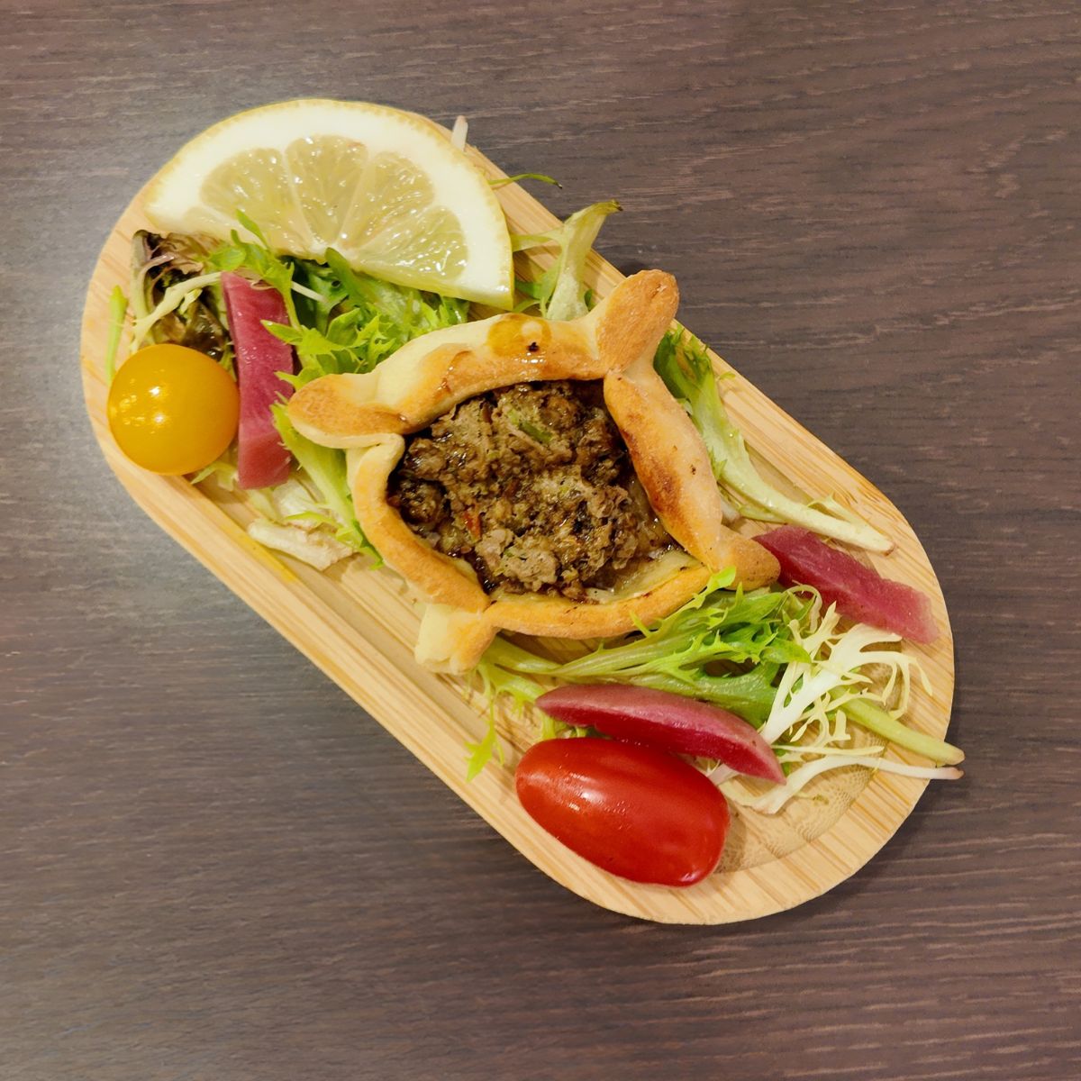 Mini pizza libanaise garnie d'un mélange de viande hachée, d'oignons, d'herbes et de tomates