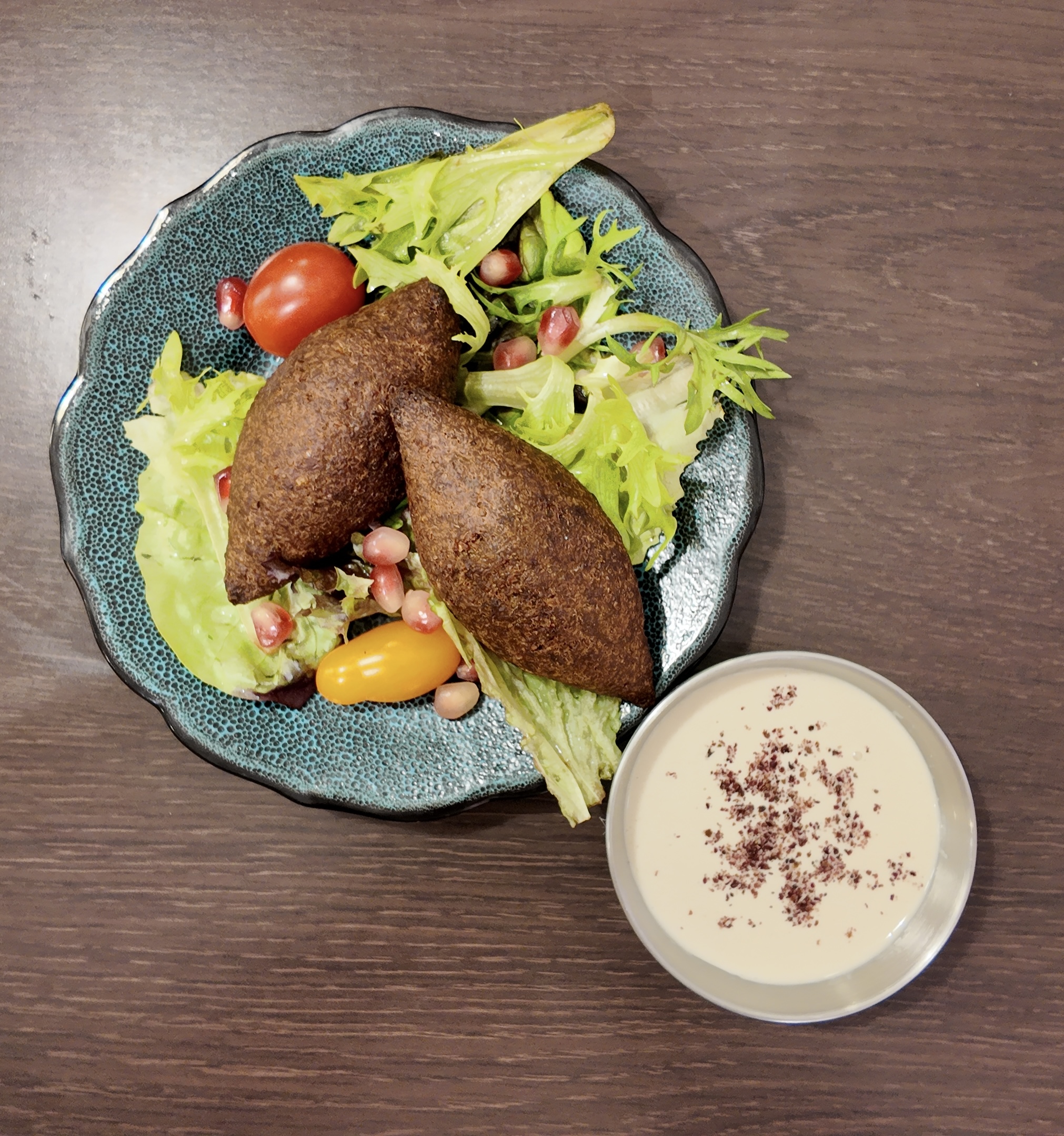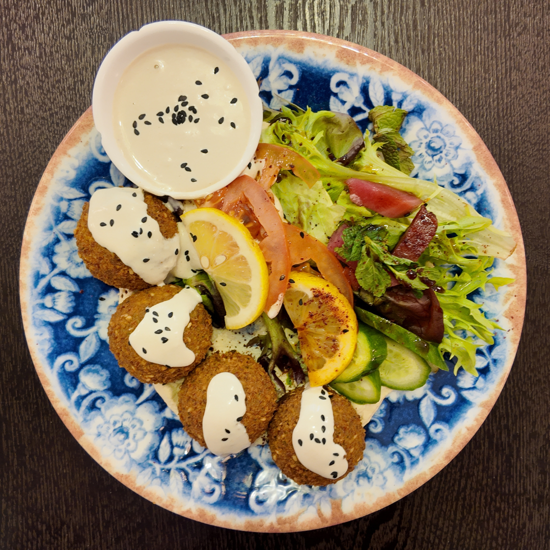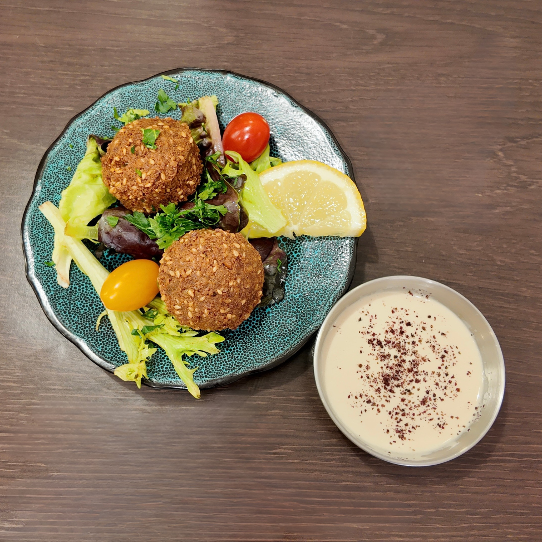 Boulettes de pois chiche, mixés avec oignon, ail, épices et herbe, accompagnées du Houmous, de crudités et sa sauce au Tahiné