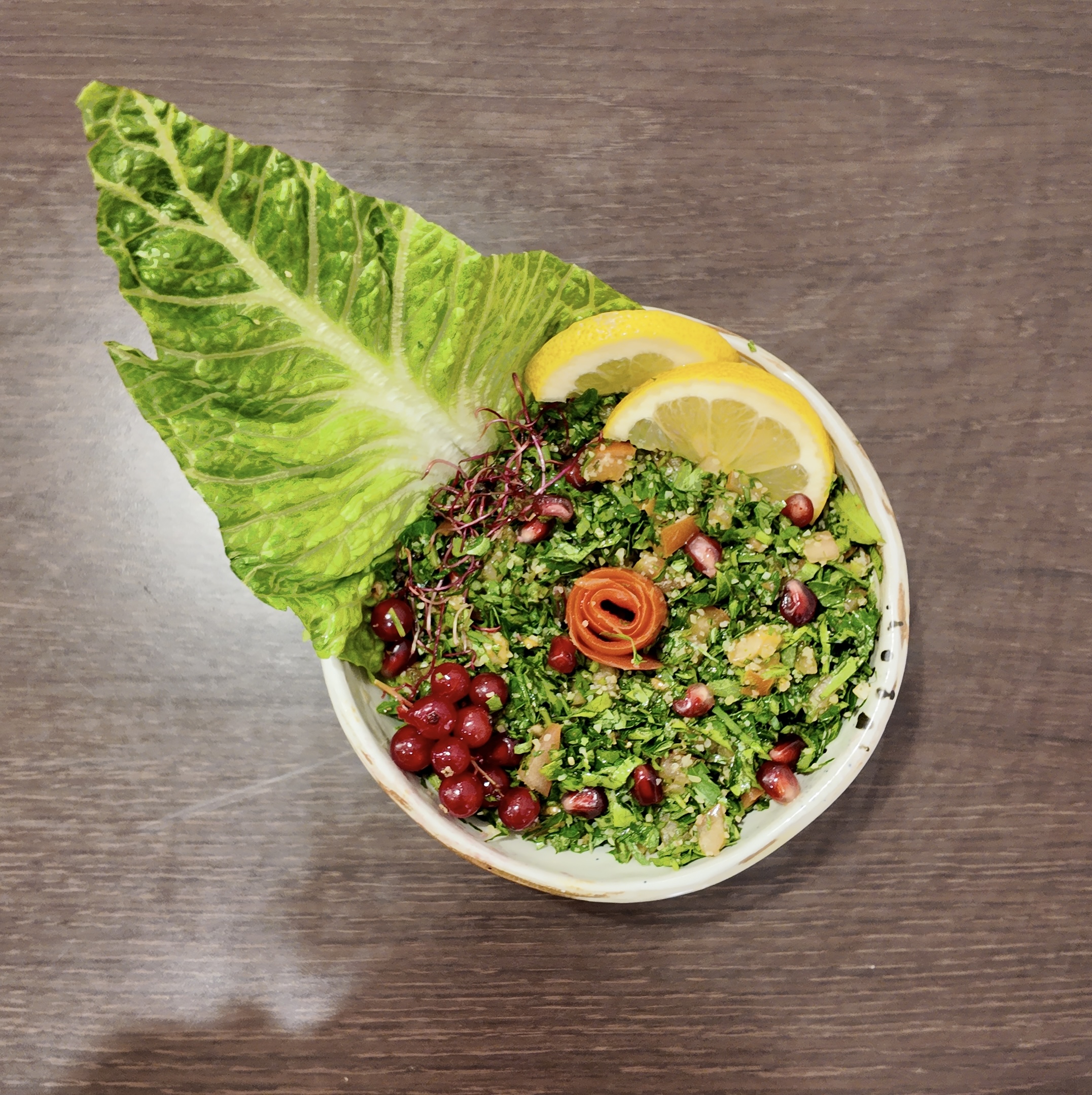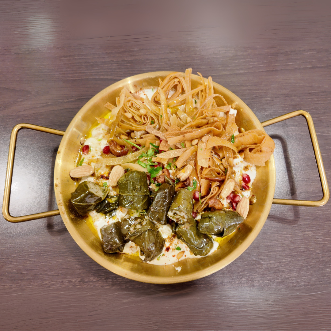 Méli-Mélo de pois chiches et feuilles de vigne farcies au riz, nappés d'une sauce au yaourt, tahini et jus de citron, relevés d'aromates orientaux. Servi sur un lit de pain croustillant, garni de fruits secs oléagineux, de navets, de concombres marinés et d'un filet d'huile d'olive.