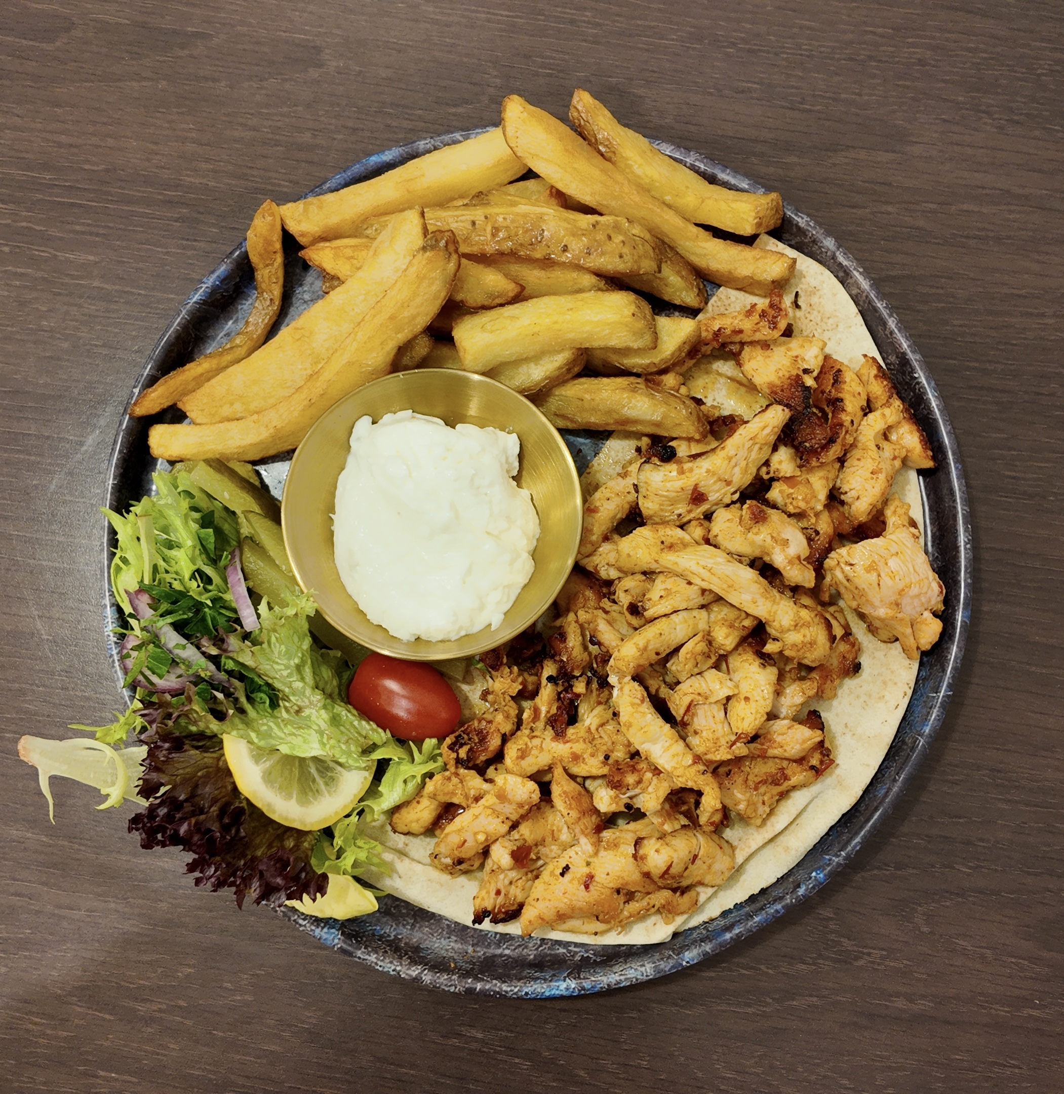 Filets de poulet émincés au couteau du Chef, marinés aux épices libanais et cuits longuement et soigneusement, accompagnées de frites (ou boulgour) et de sauce Toum (crème d'ail)