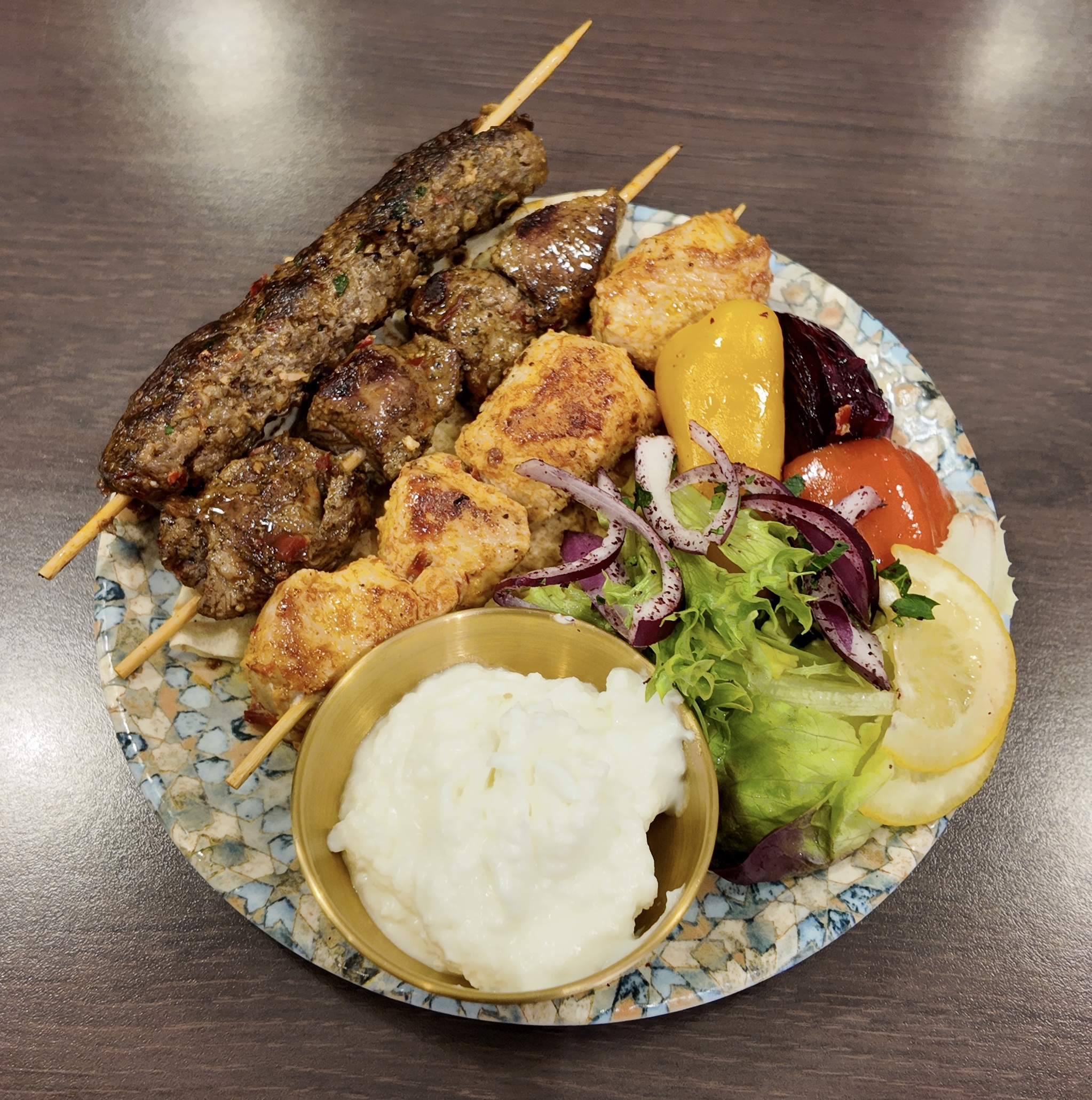 Deux brochettes de viande d'agneau, agréablement parfumée et marinée, sauce tahiné