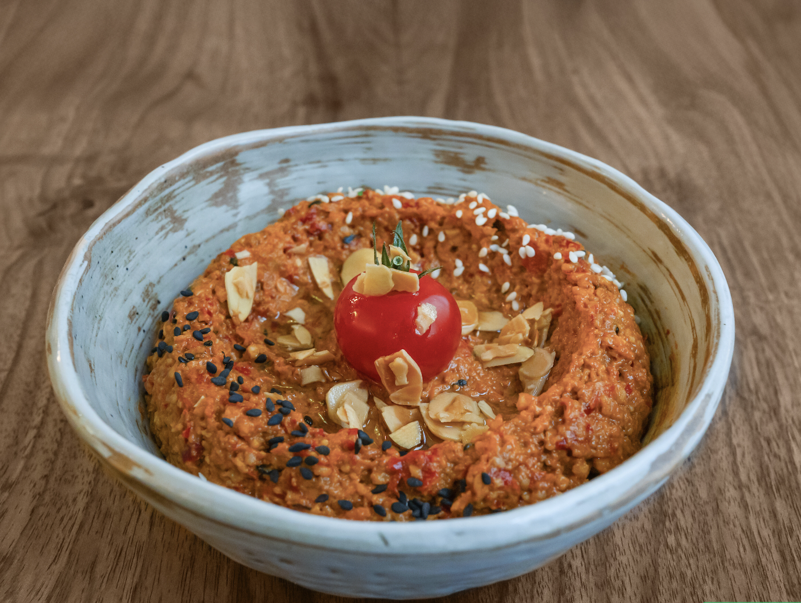 Caviar de poivrons grillés aux noix broyées, assaisonné d'huile d'olive et de jus de citron